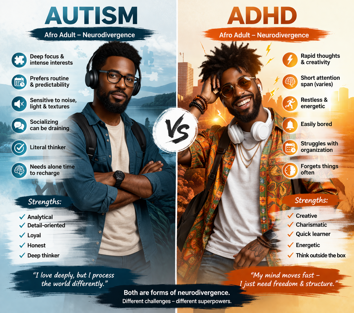 Autism and ADHD can share some features, but autism mainly affects communication and social interaction, while ADHD mainly affects attention and impulse control.