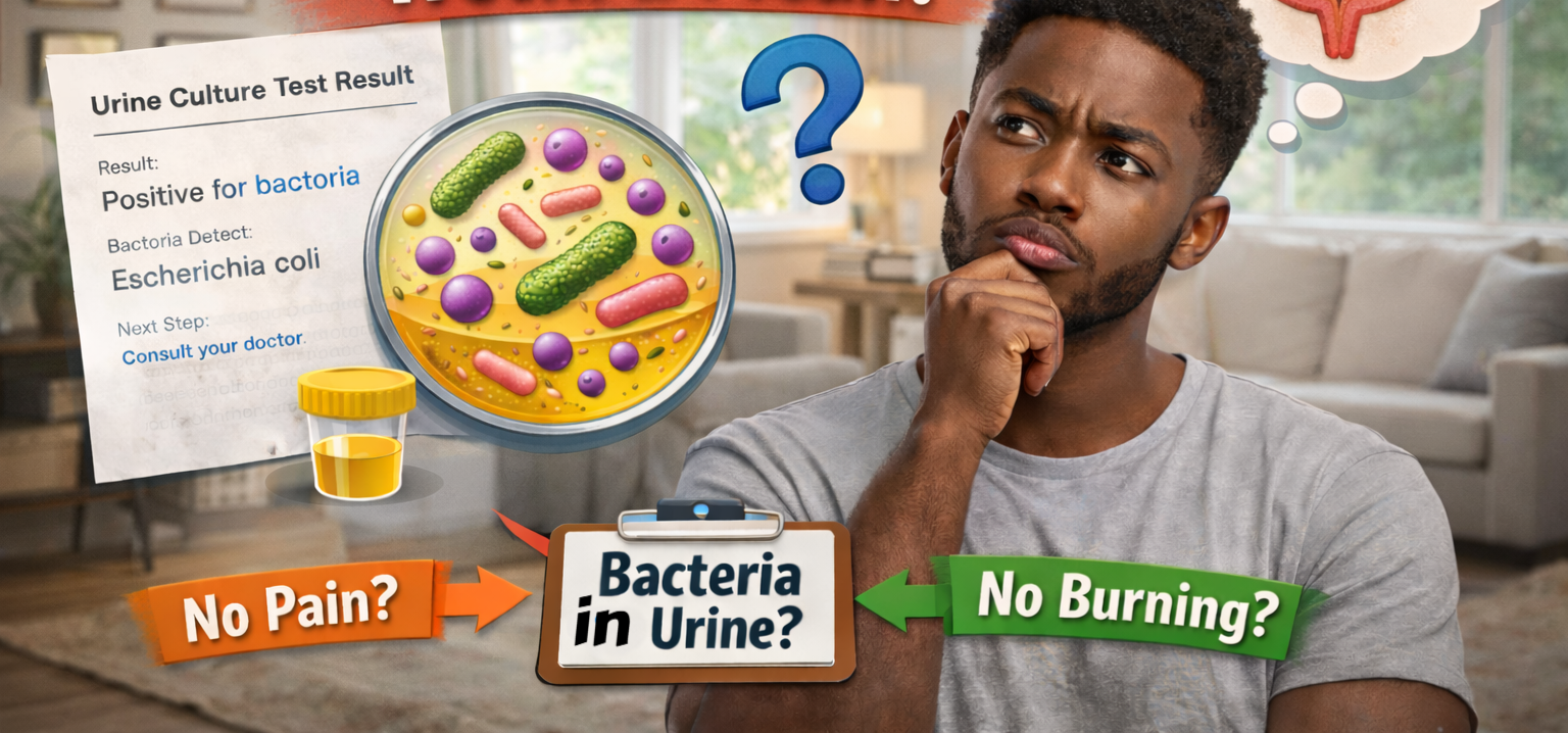 Asymptomatic bacteriuria means bacteria are found in urine—without any symptoms.