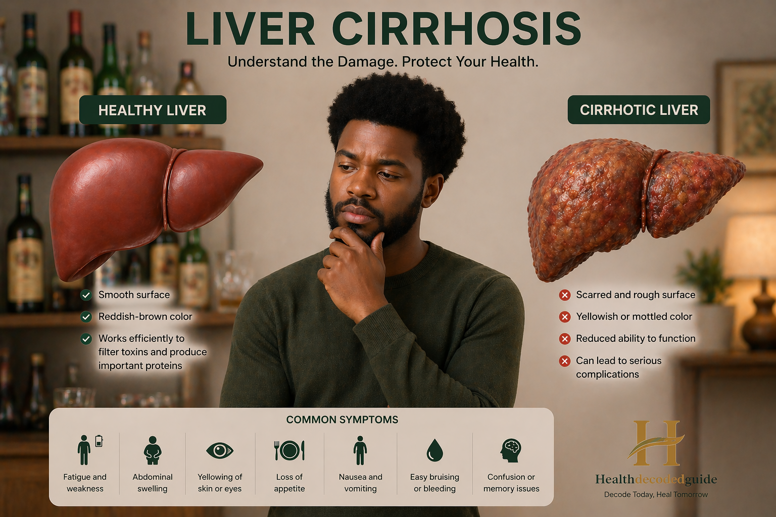 Liver cirrhosis is long-term damage to the liver causing scarring and reduced function.