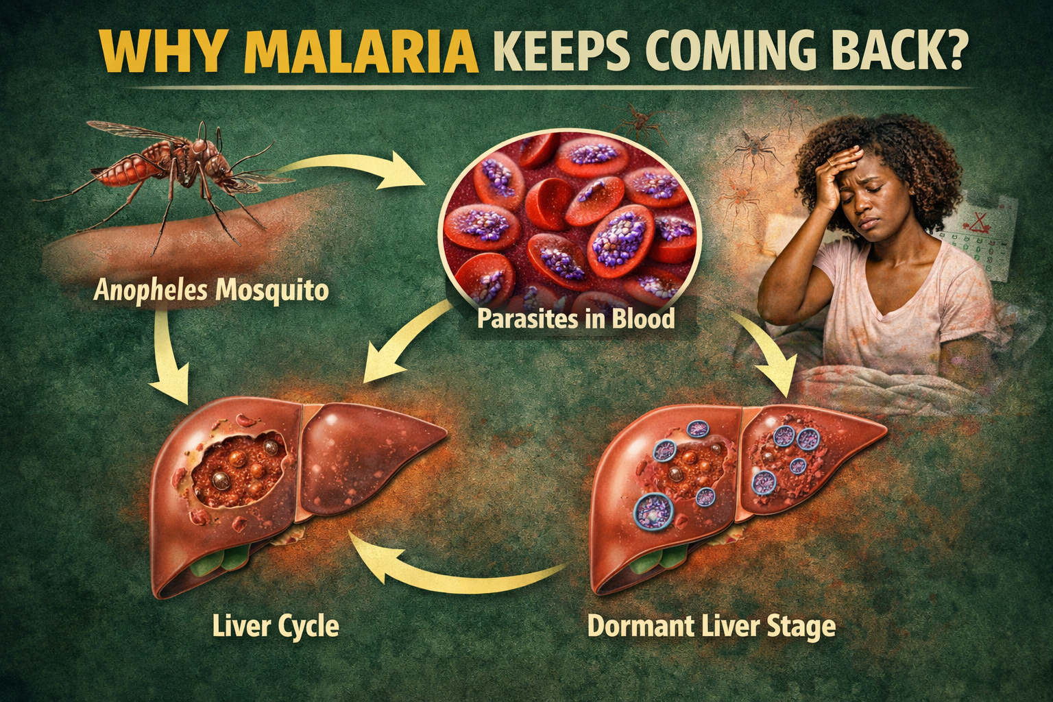 Malaria fit come back because of new mosquito bite, incomplete treatment or because say the parasite dey hide for liver.